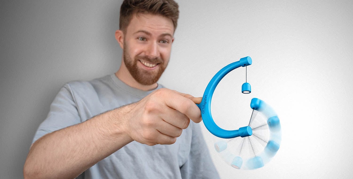 Mit einer geschickten Drehbewegung lässt man die Magnete um die Halterung schwingen und versucht, sie durch ihre magnetische Anziehungskraft in der Luft zusammen „flippen“ zu lassen.